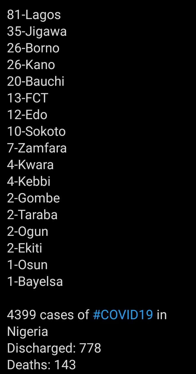 NCDC also announced that the total confirmed cases of coronavirus in Nigeria as hit a cumulative of 4,399 as at Sunday 10th of May 2020